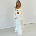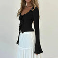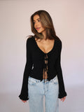 De blouse heeft lange mouwen en een diepe halslijn. De blouse kan naar wens gestrikt worden.