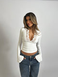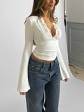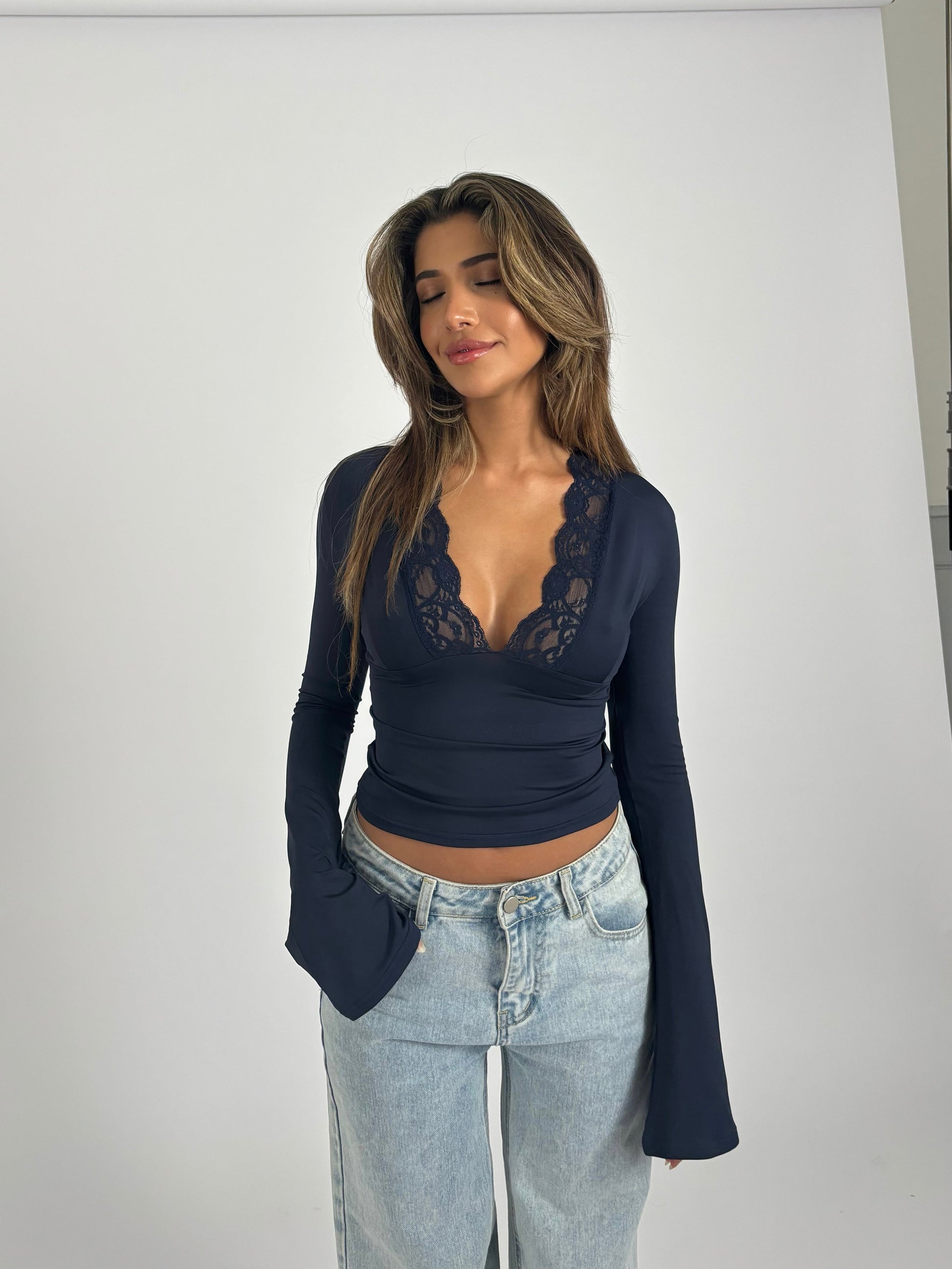 Mooie top met kanten rand van materiaal met veel stretch, wat mooi aansluit op het lichaam. De top heeft lange mouwen en een diepe halslijn.