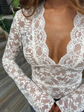 Mooie kanten top van materiaal met veel stretch, die mooi aansluit op het lichaam. De top heeft lange mouwen en een diepe halslijn.